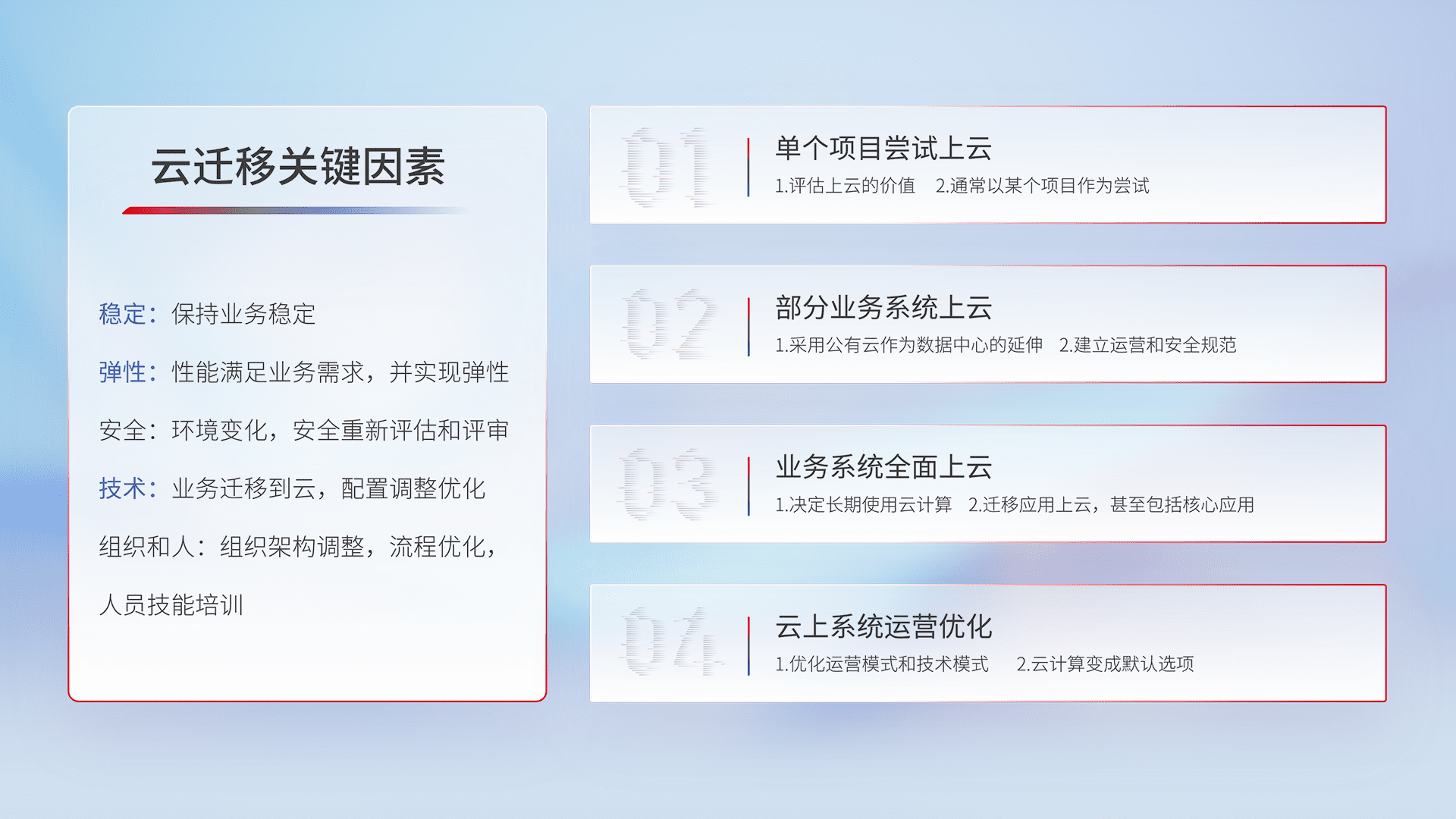 结合实际业务,,从规划设计、、云平台选型、、、、云原生改造、、数据迁移、、、、集成交付,,迁移全过程为客户识别最佳上云路径,,做好风险识别管理,,,,设计网络架构、、、、身份权限、、、安全审计合规、、操作审计、、、、日志审计、、、、监控告警策略、、多站点容灾设计等,,对云上基础设施进行整体规划,,提升IT治理水平,,,,以满足弹性、、、、高可用、、、高性能的需求。。